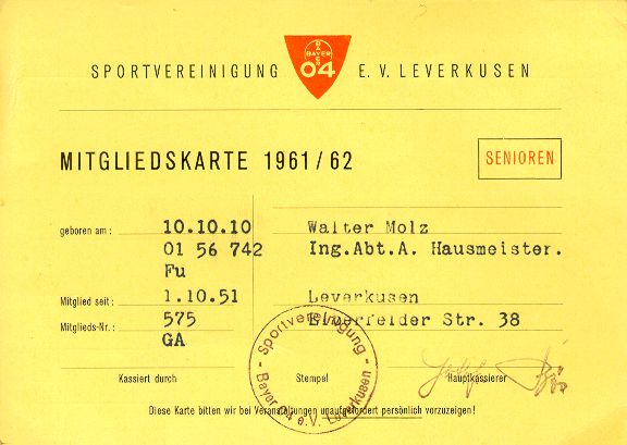 Mitgliedskarte Bayer 04 1961 (Mitglied seit 1951)